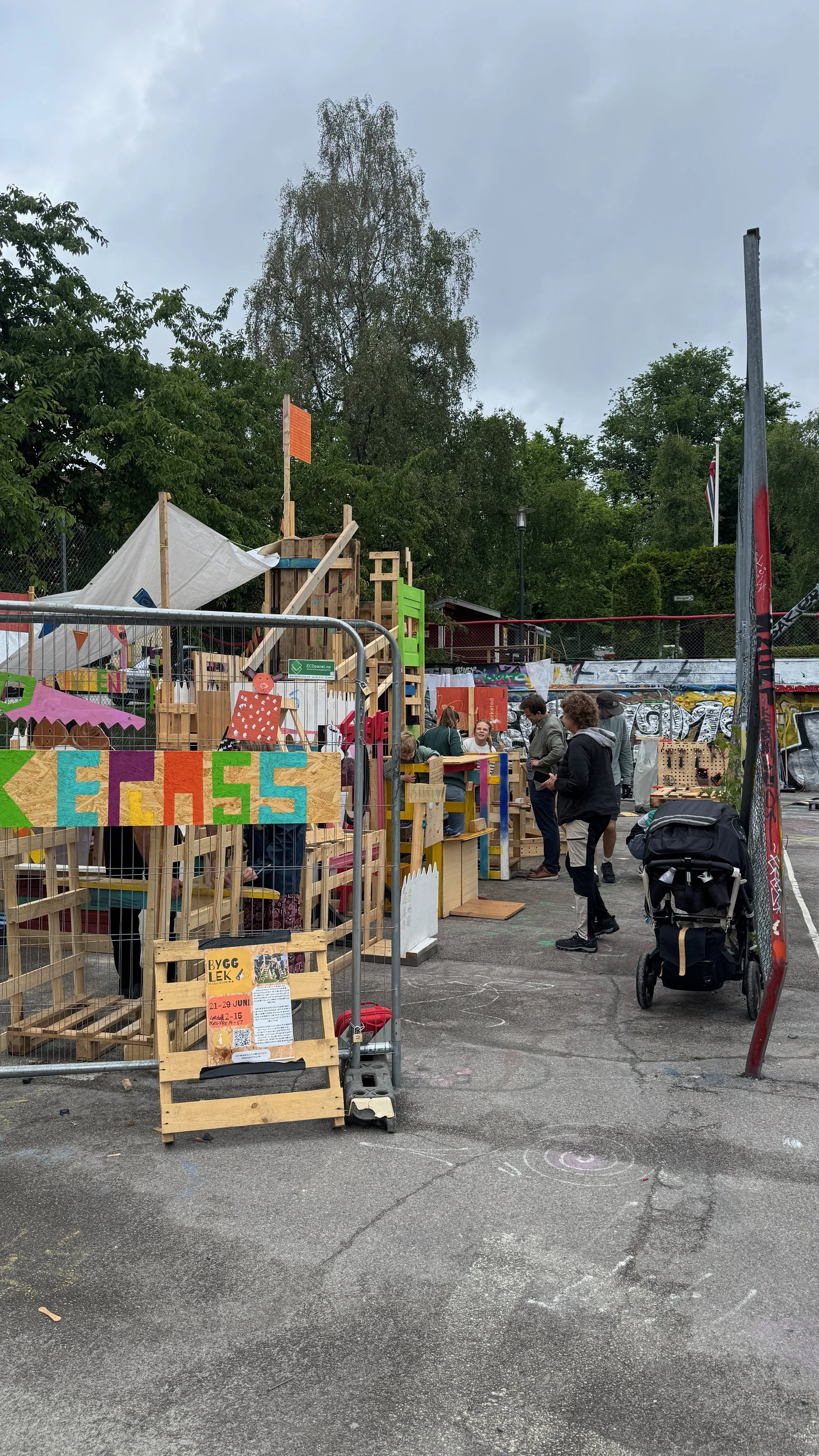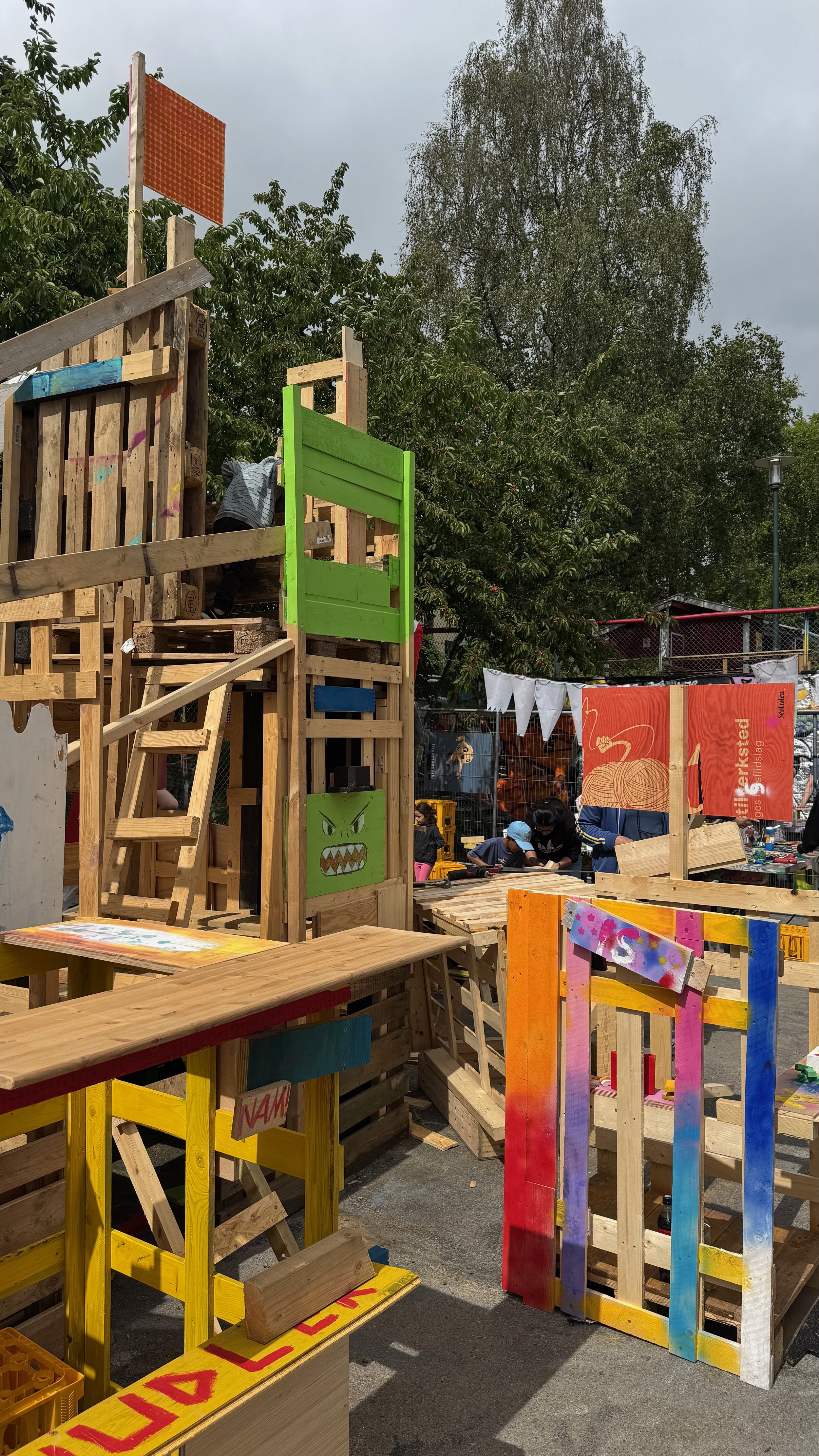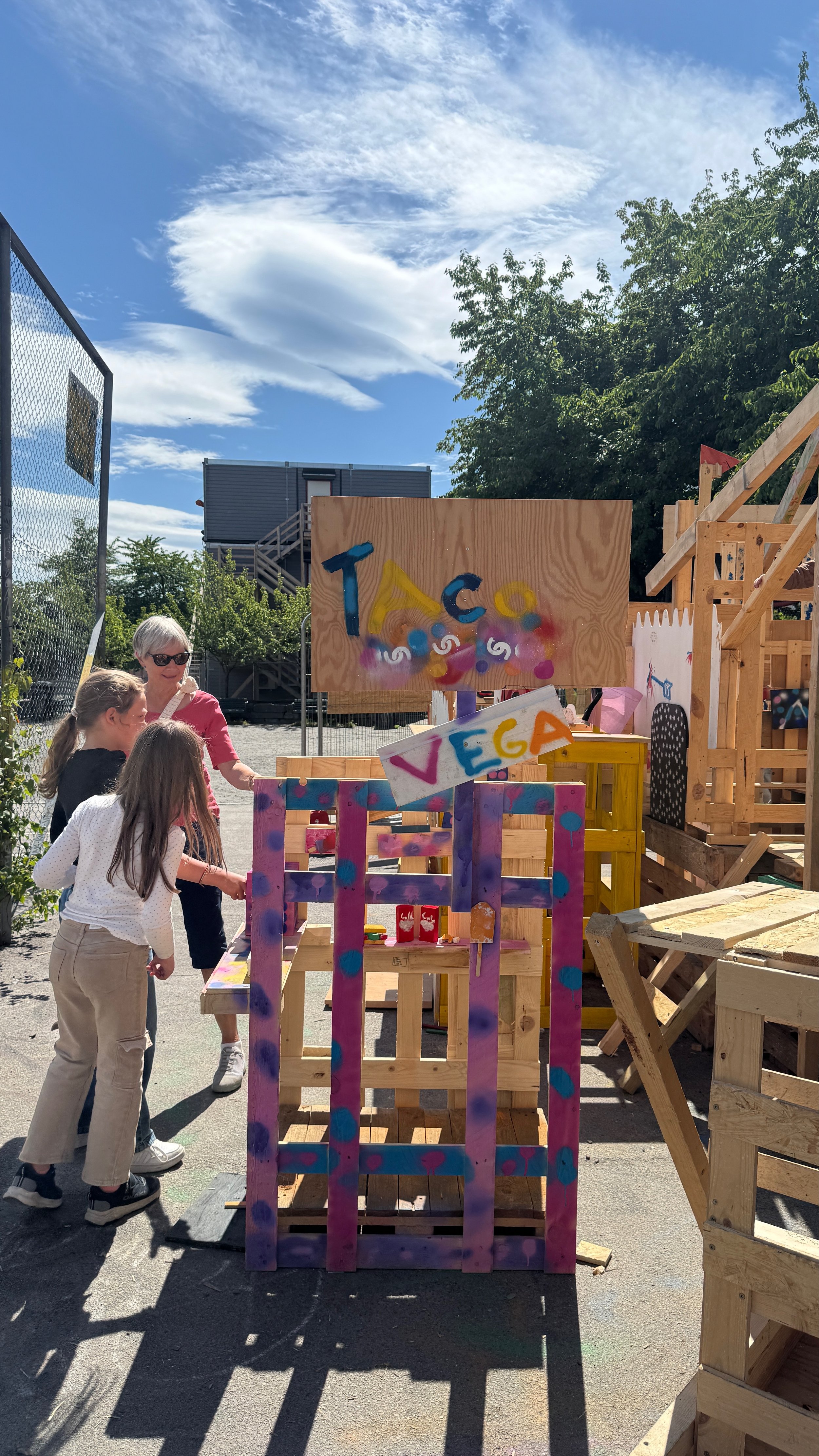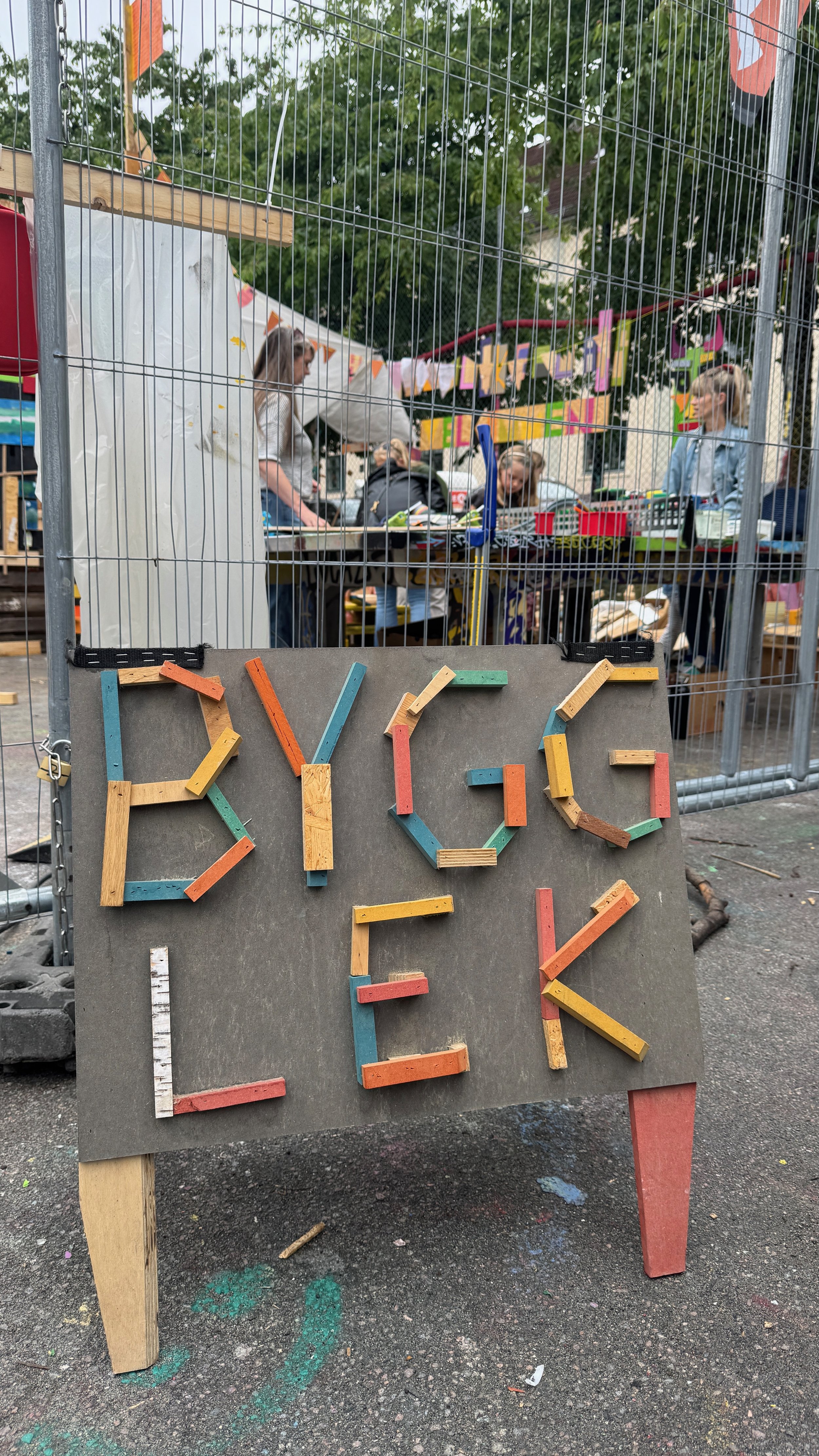 Med enkle verktøy og gjenbrukte materialer får barna bygge strukturer og objekter som til sammen blir til en bygglekeplass.