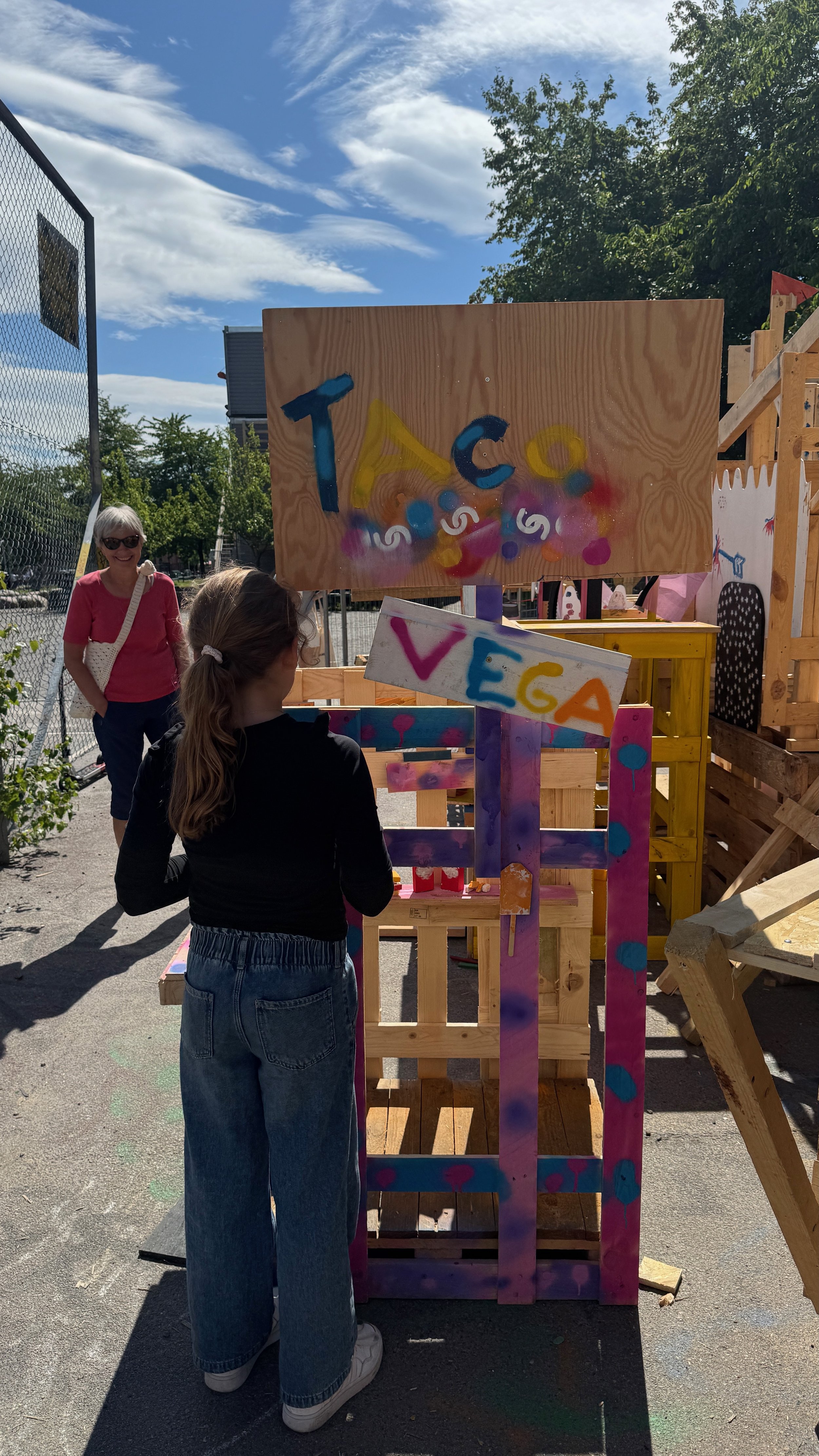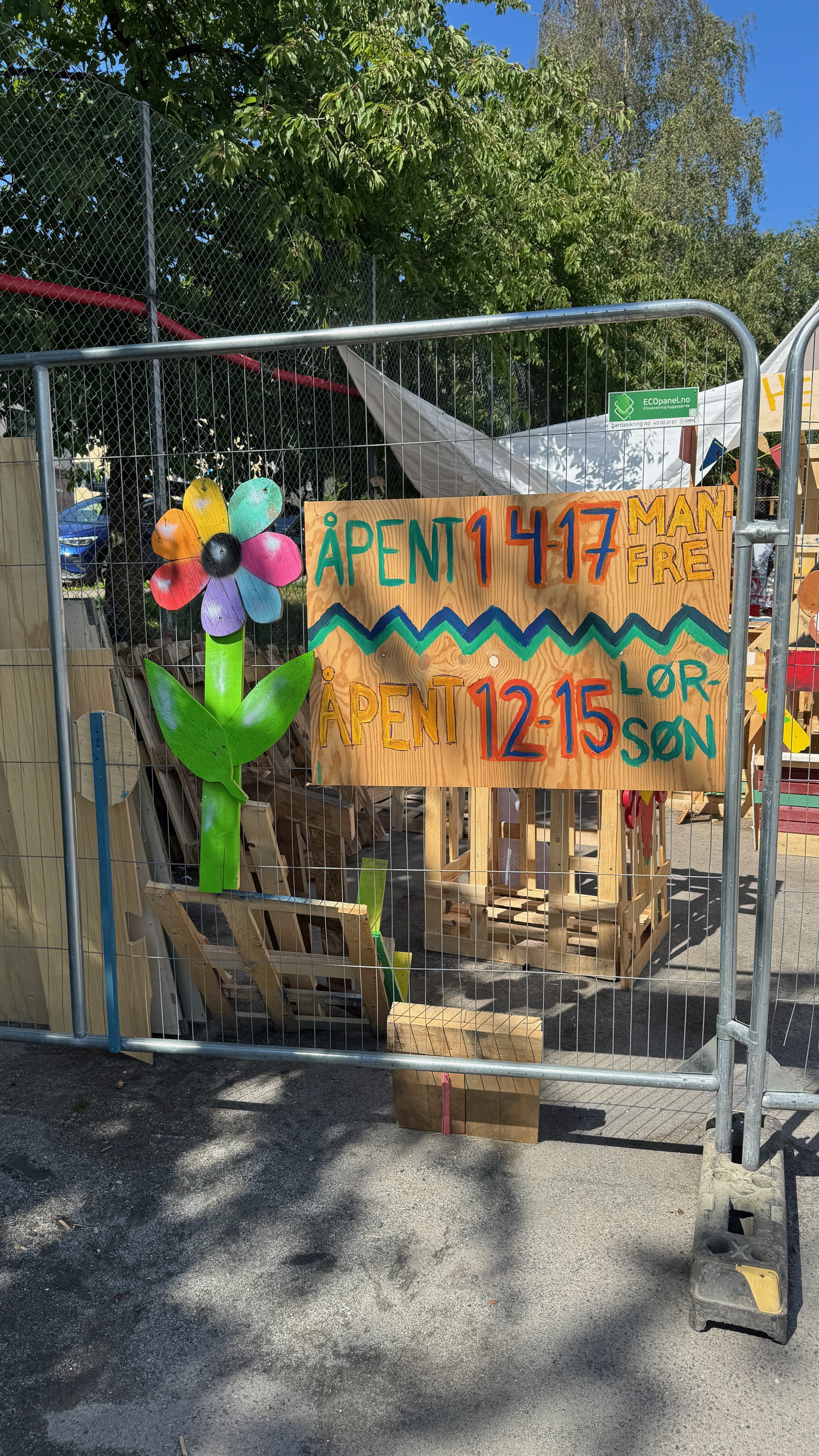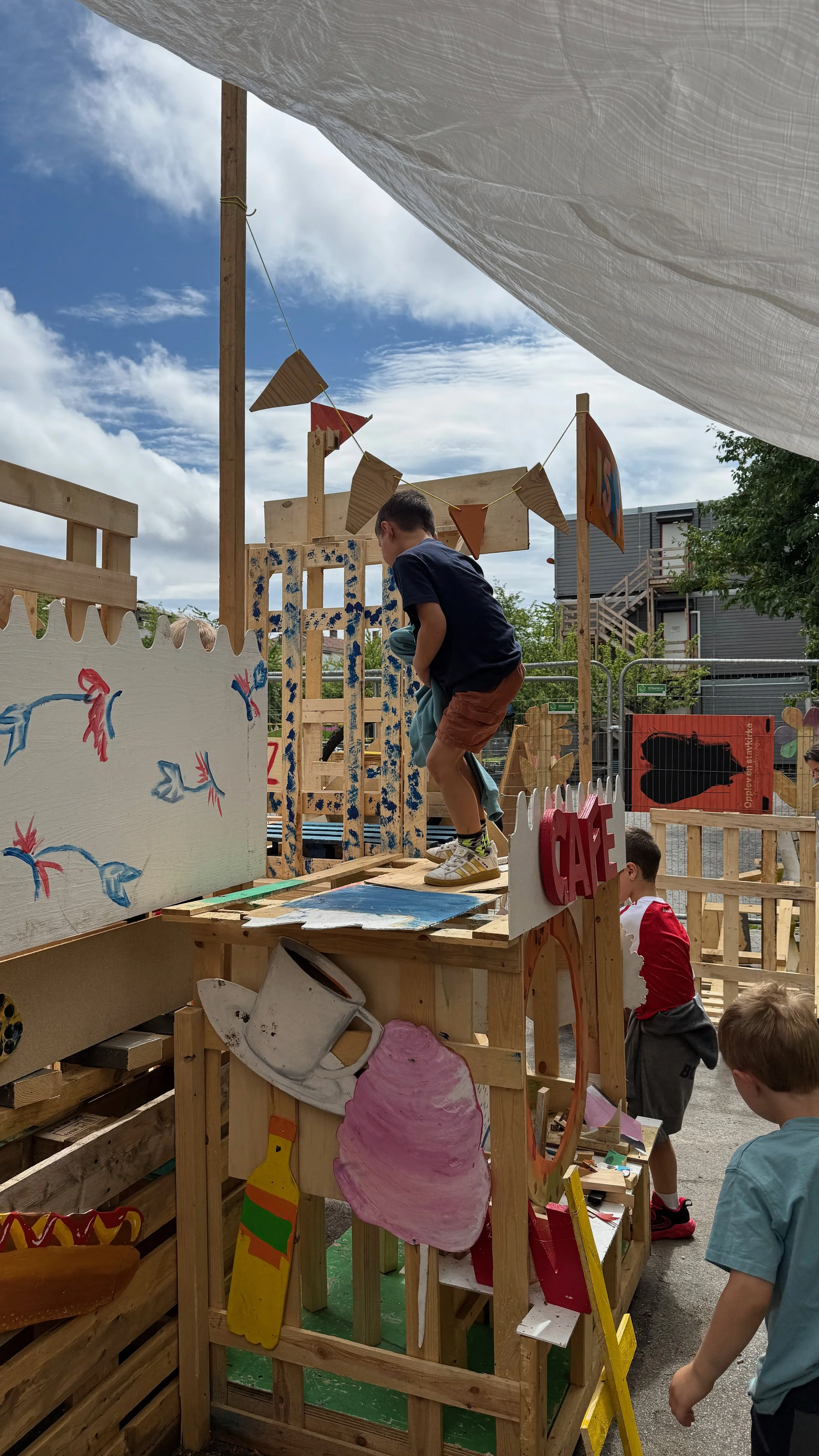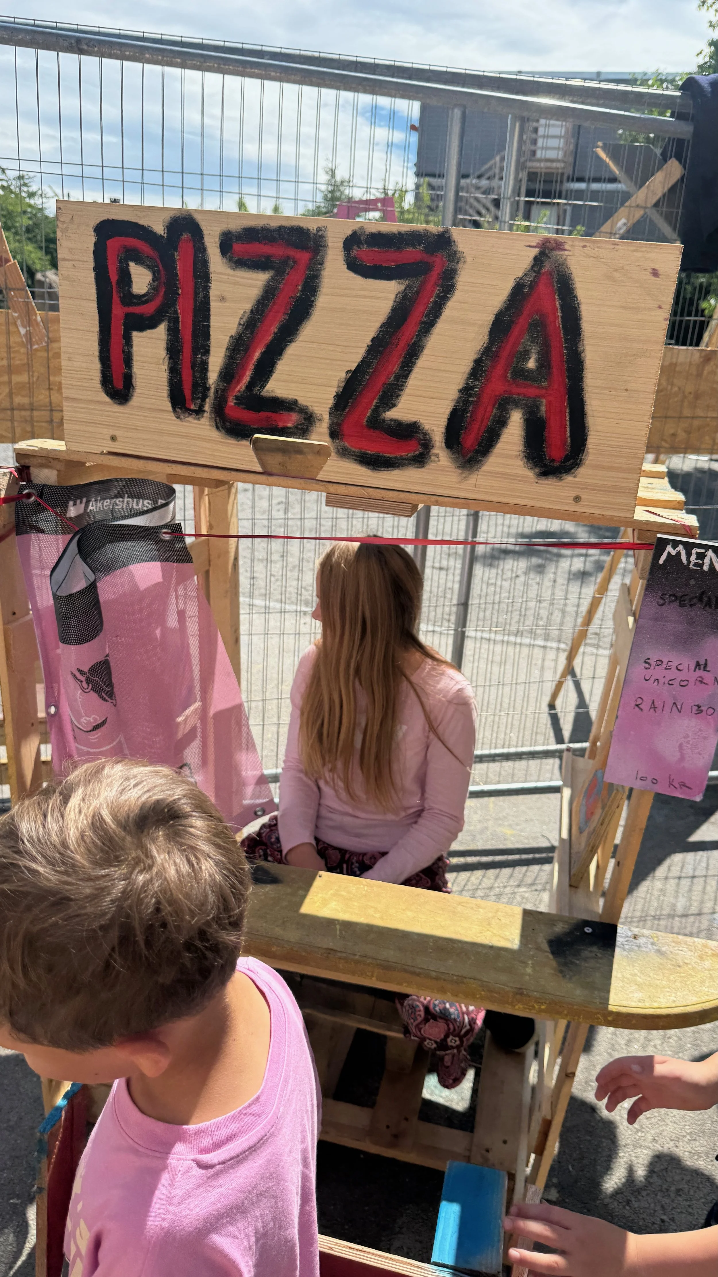Med enkle verktøy og gjenbrukte materialer får barna bygge strukturer og objekter som til sammen blir til en bygglekeplass.