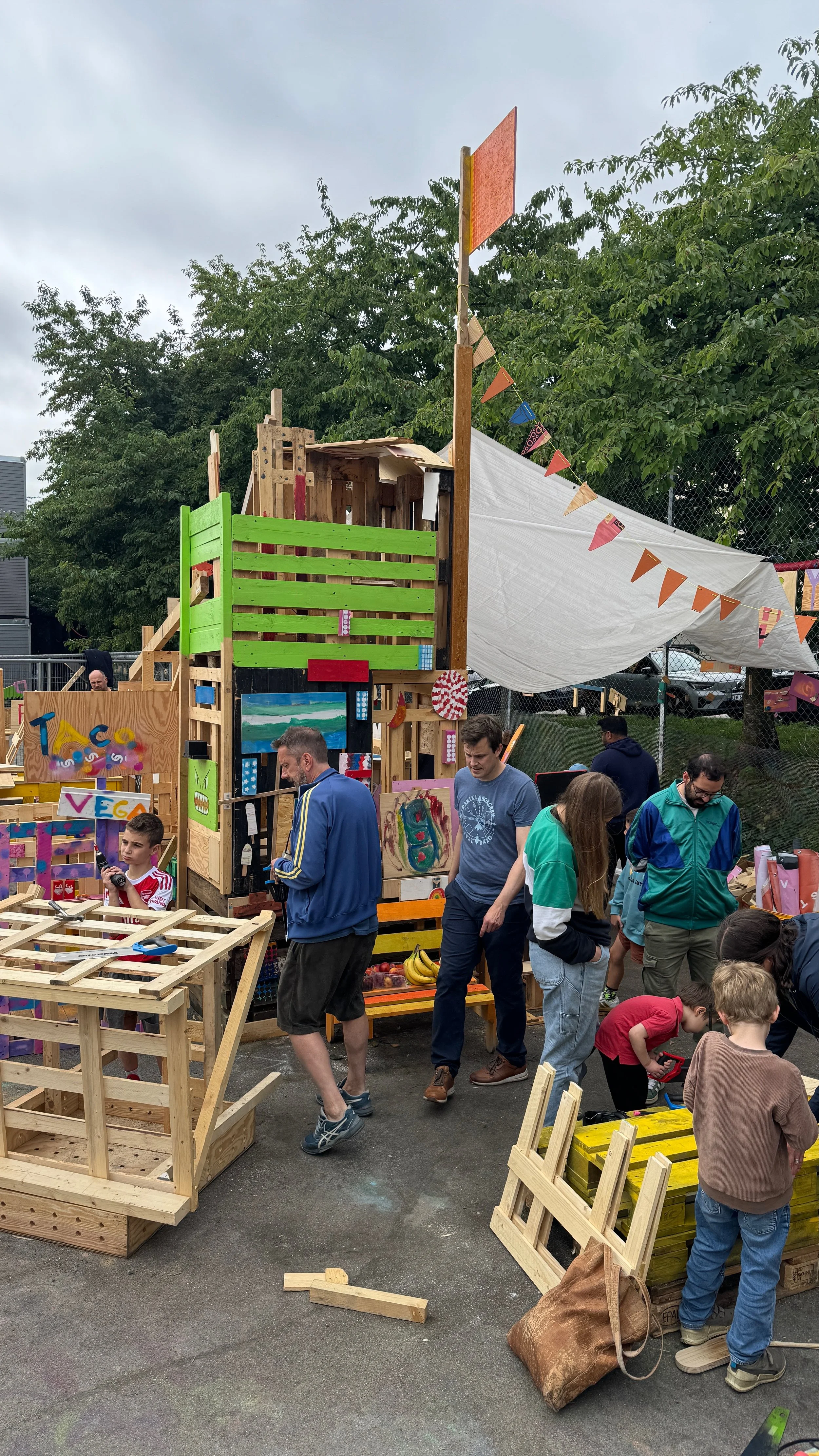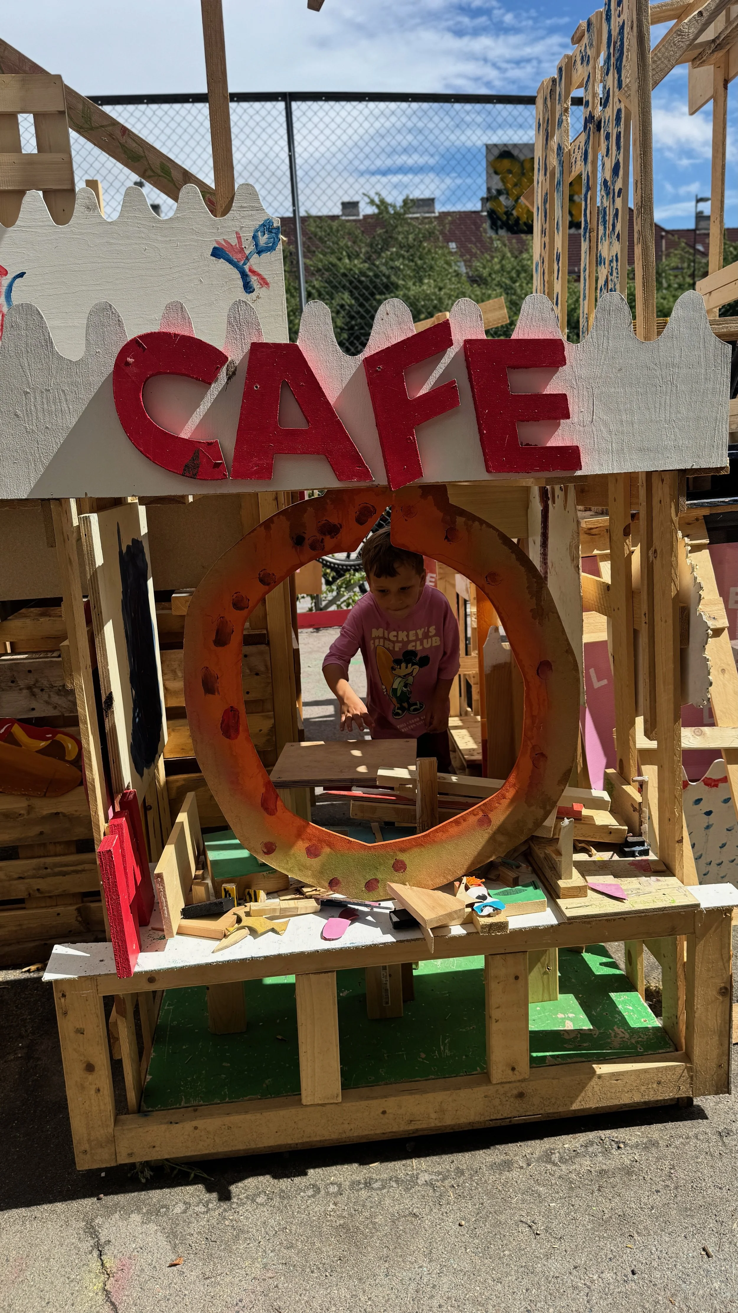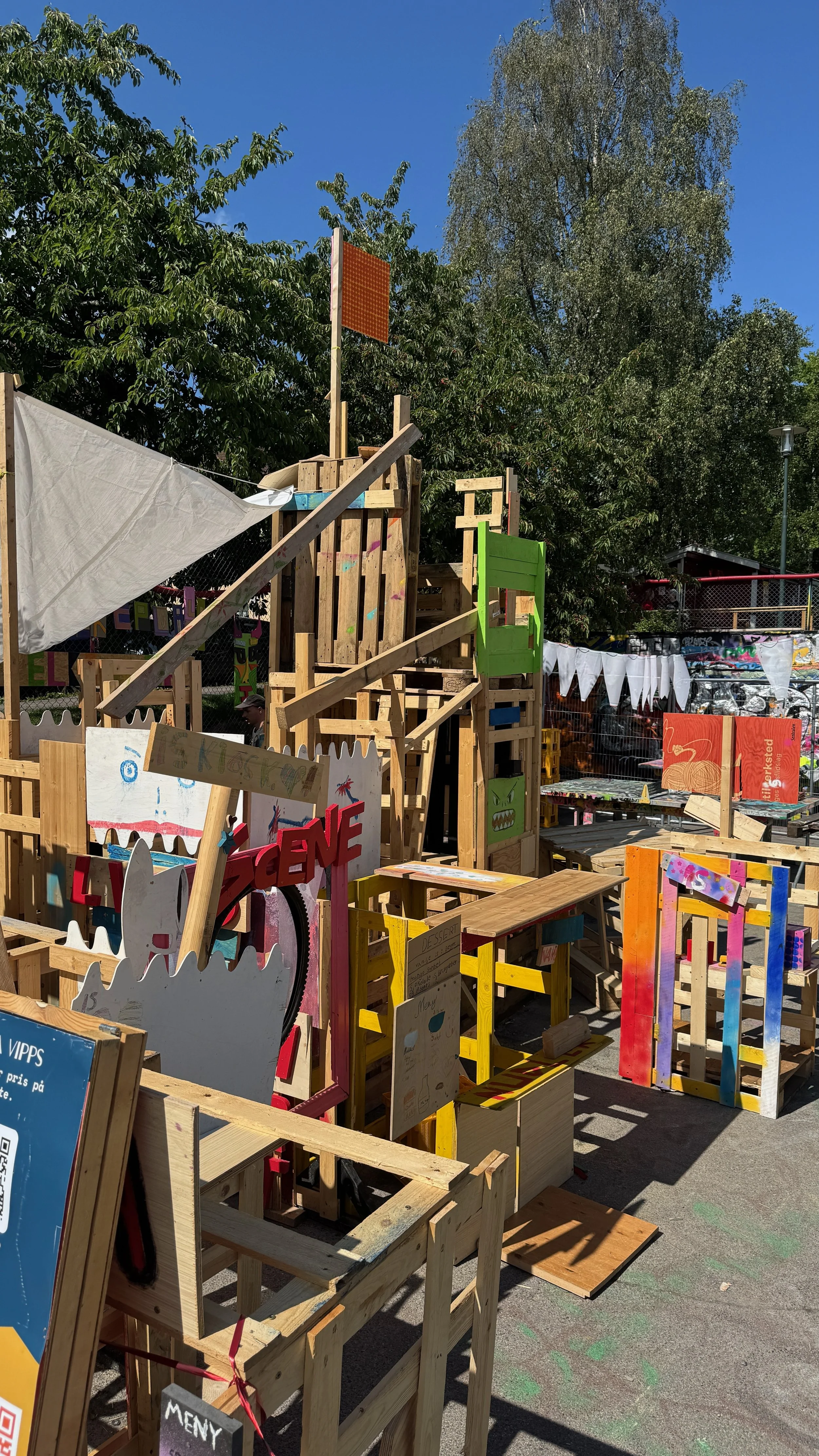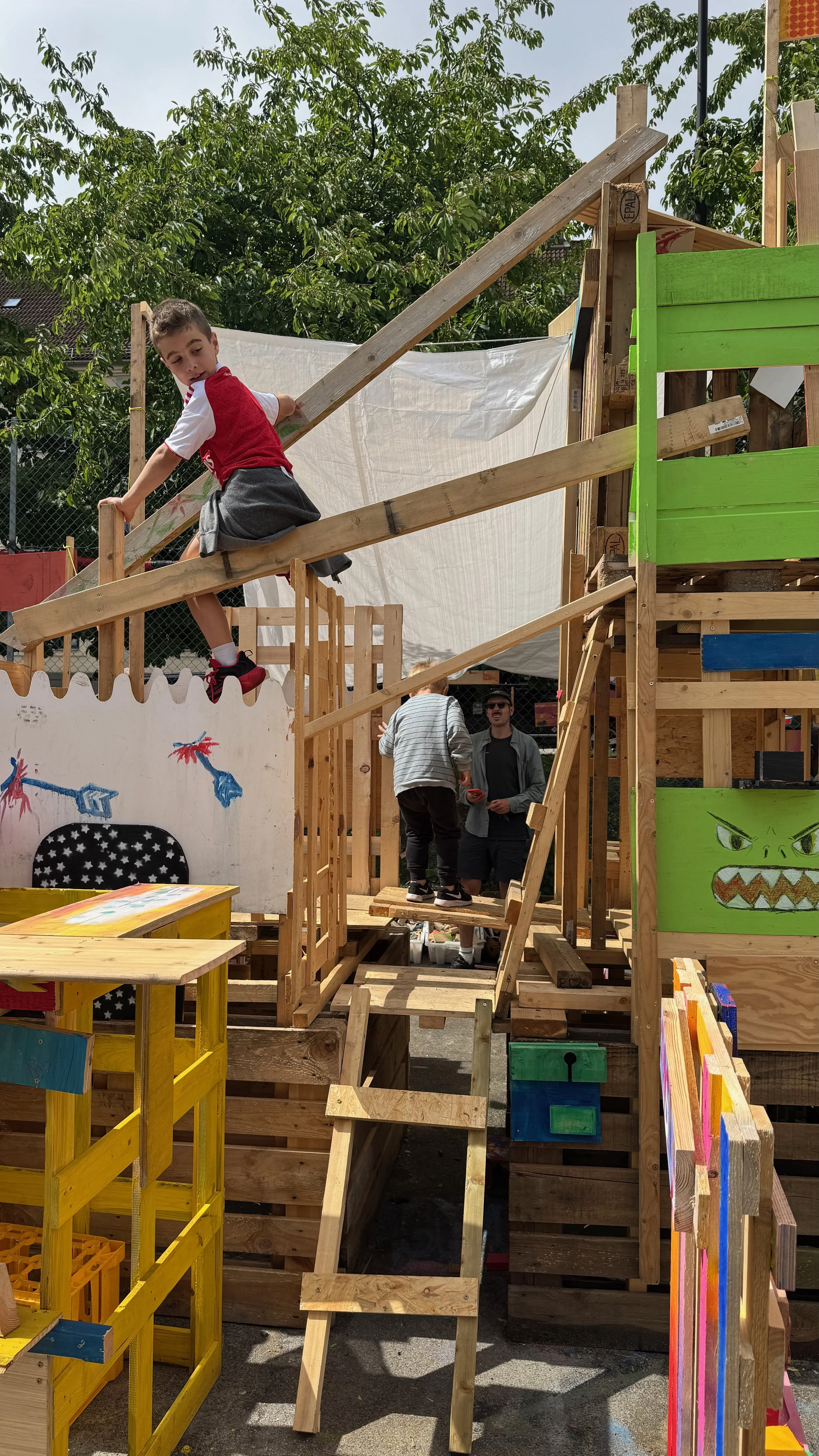 Med enkle verktøy og gjenbrukte materialer får barna bygge strukturer og objekter som til sammen blir til en bygglekeplass.
