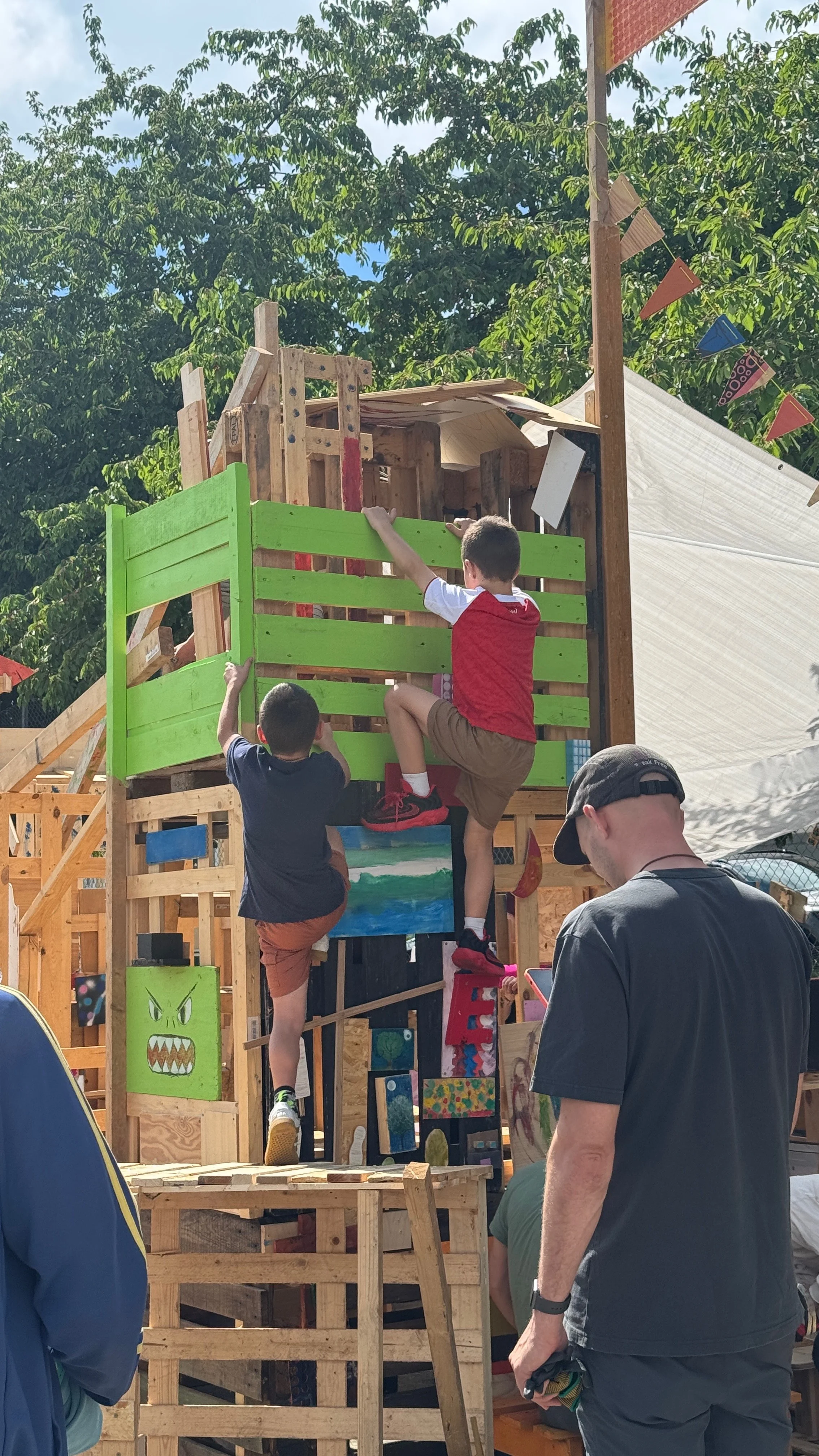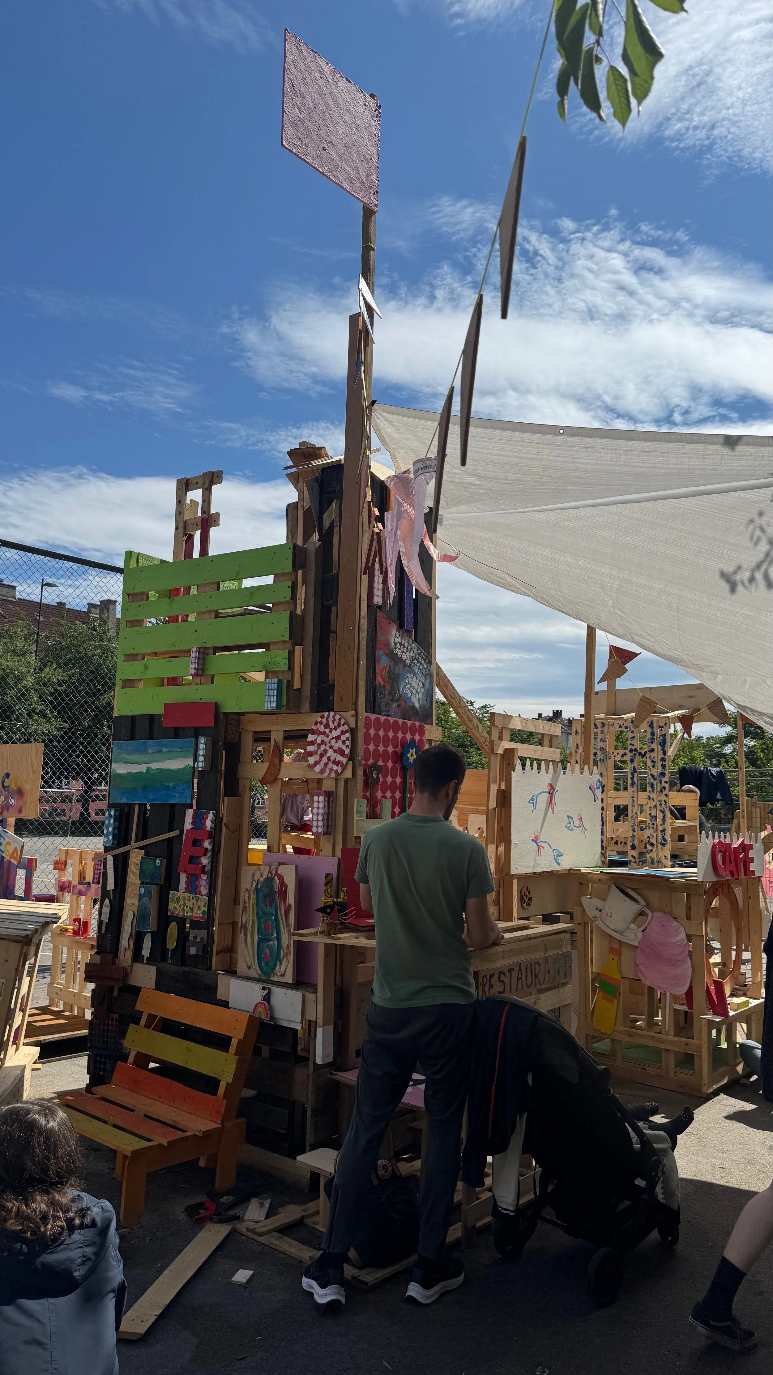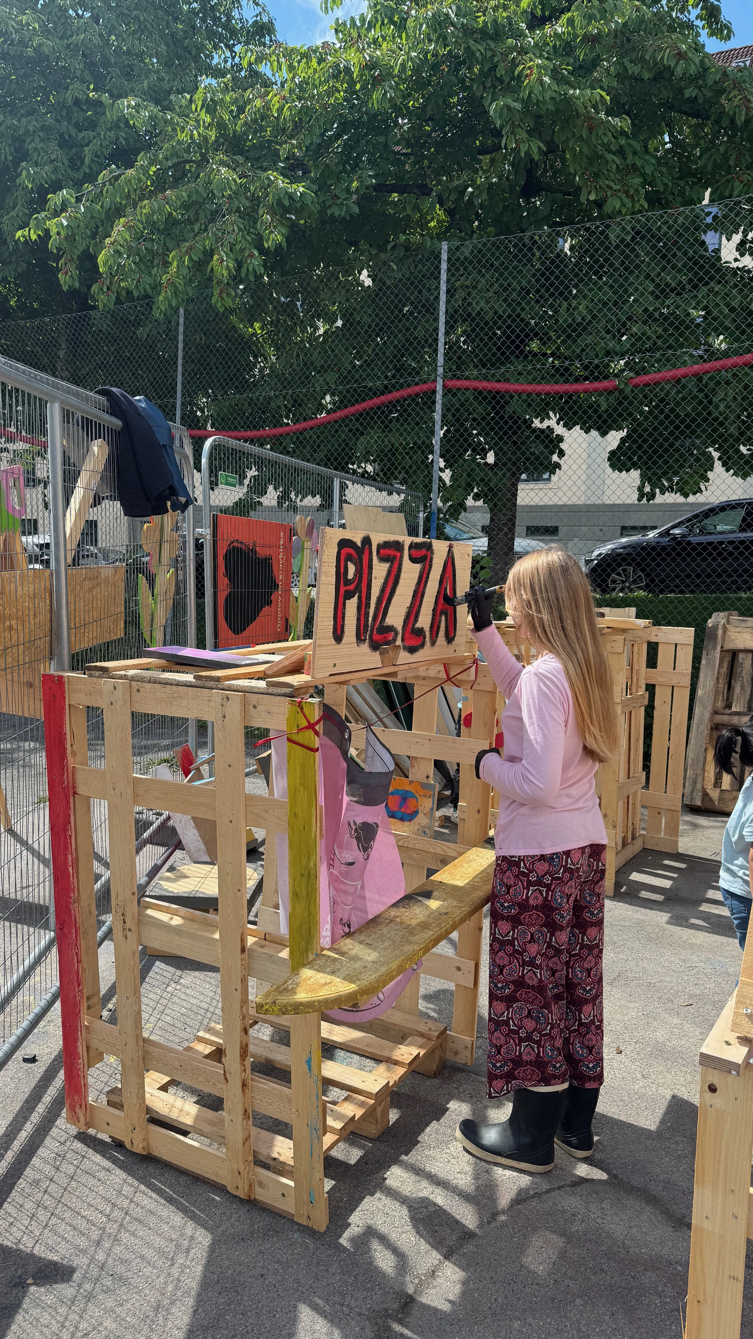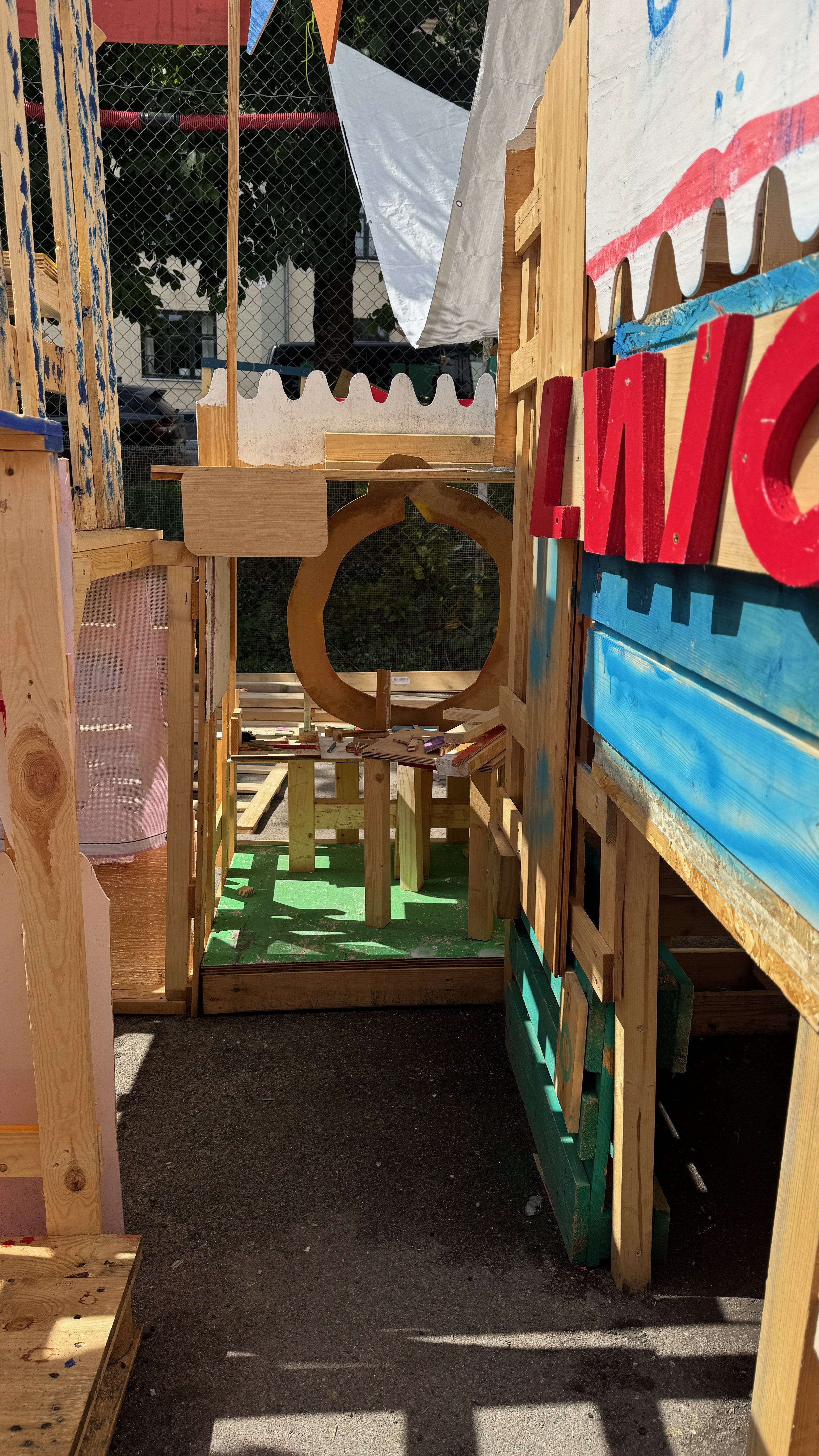 Med enkle verktøy og gjenbrukte materialer får barna bygge strukturer og objekter som til sammen blir til en bygglekeplass.