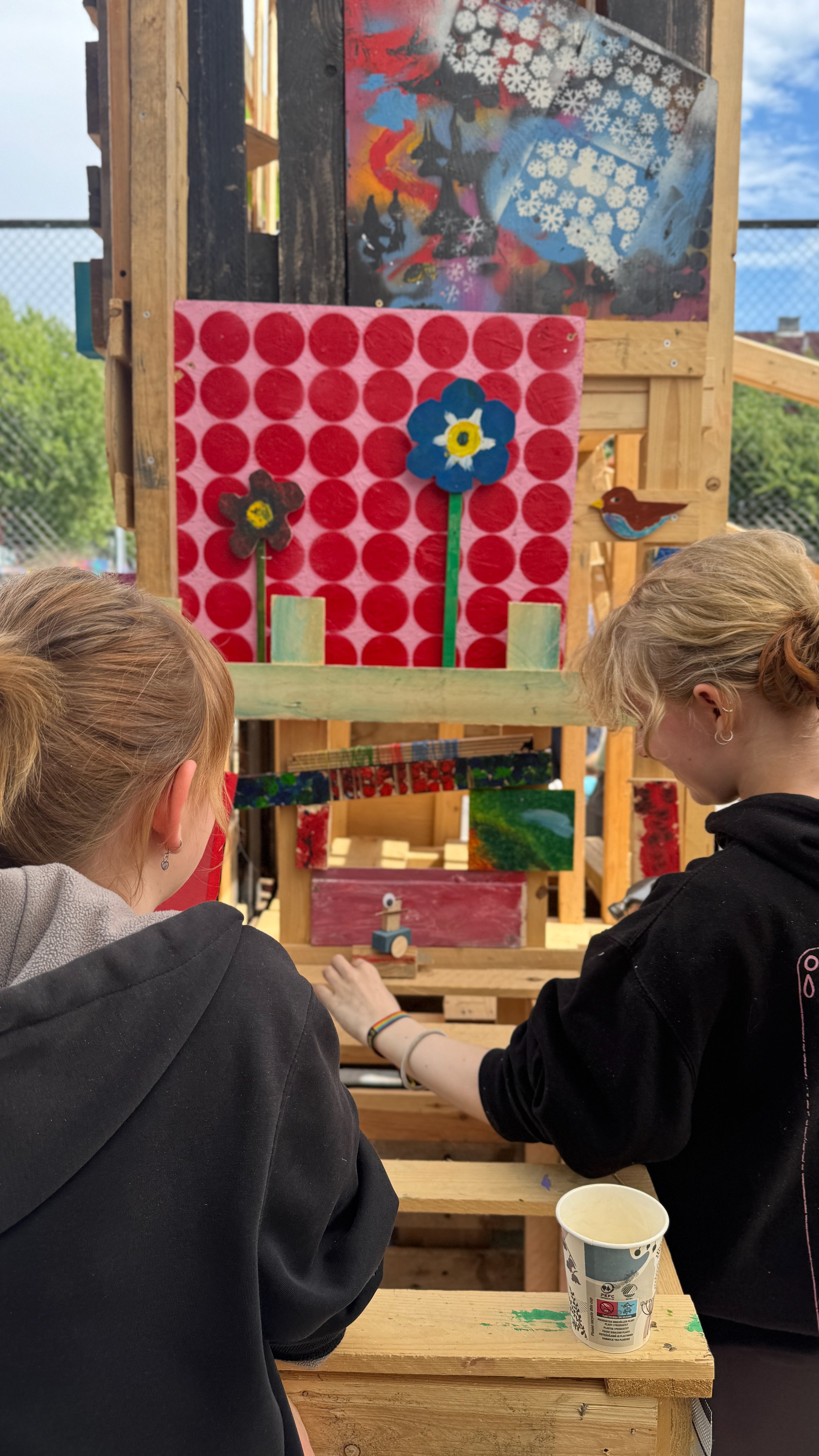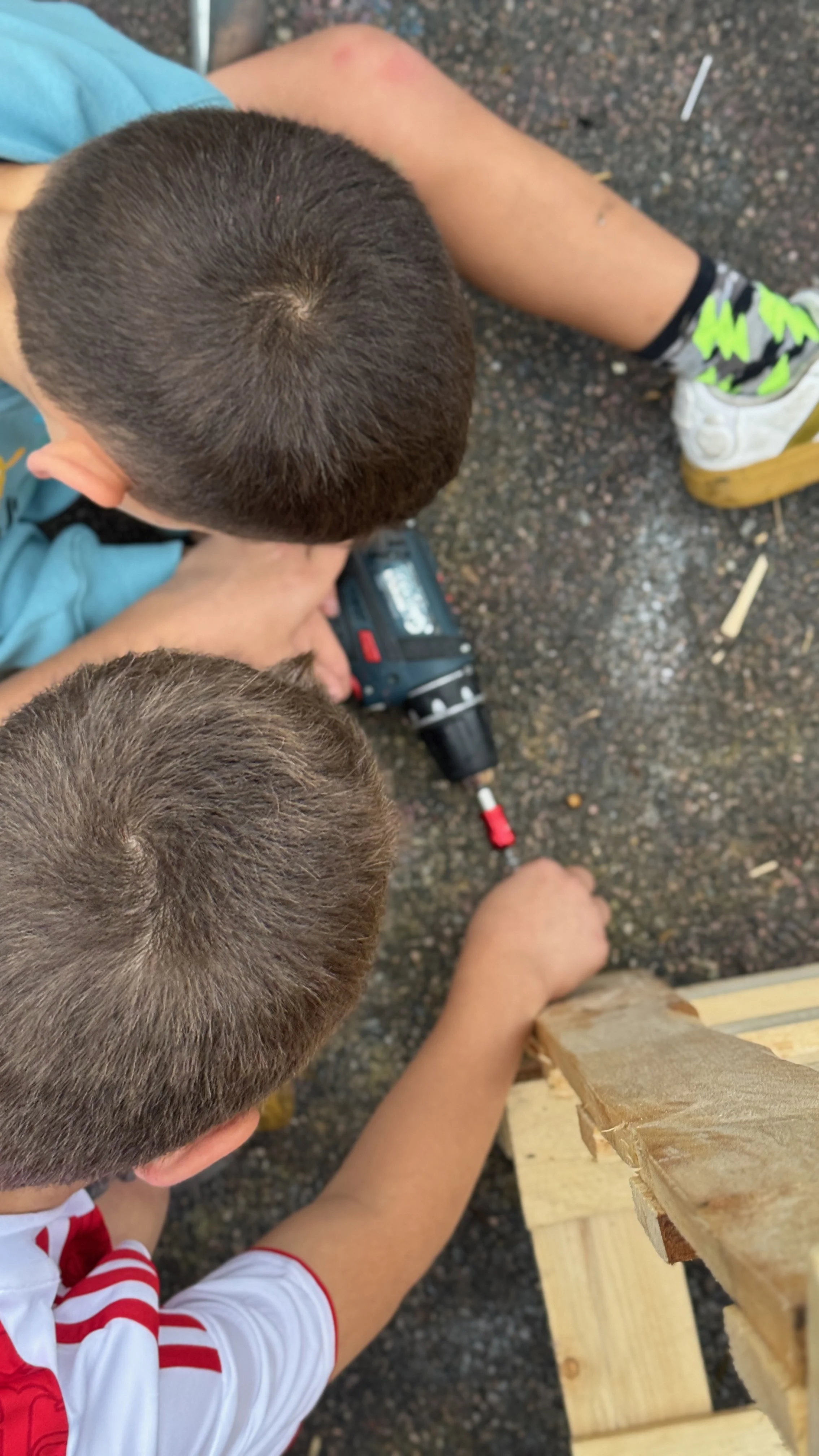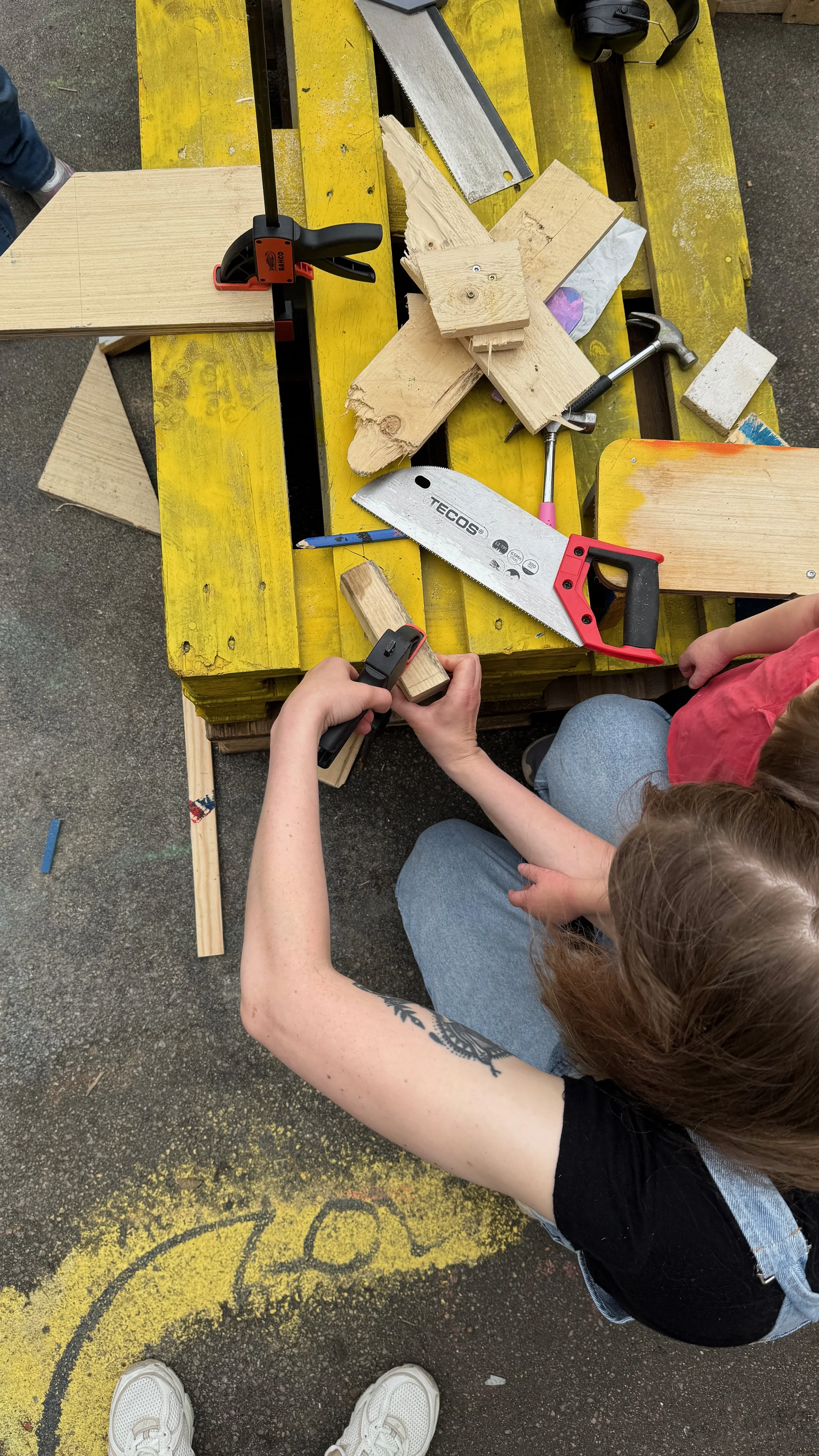 Bygging: Med enkle verktøy som hammer, sag og limpistol, samt gjenbrukte materialer, setter barna i gang med å bygge sine strukturer og objekter.